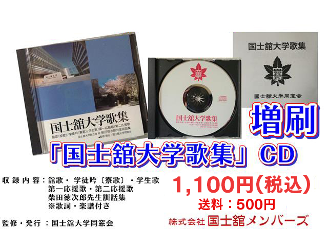 国士舘創立100周年を記念して、同窓生の皆様には在学中の輝かしい青春時代を思い出していただくため「国士舘大学歌集」のCDを増刷致しました。